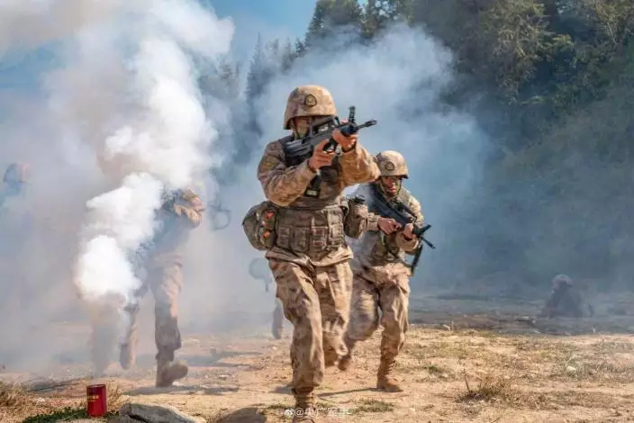 解放軍步兵在模擬的複雜地形中快速推進,與模擬敵軍進行近距離戰鬥。