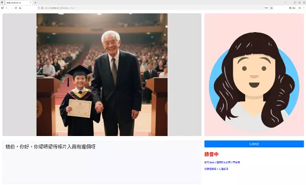 聊天機械人系統透過利用真實的家庭照片進行對話資料訓練,使機械人與長者的互動更自然、更貼近生活。系統鼓勵長者分享日常生活,並透過家人或照顧者上傳的家庭近況照片作對話主題,加強長者與家人的連結,此設計亦能令長者更有興趣與聊天機械人互動。為了使對話更親切及富意義,我們設計了一個對話代理來分析聊天過程,將閒聊與引導性問題融合在一起。它的技術架構支援內部應用與雲端服務,兼顧安全性與彈性,讓長者服務機構與家人可按需求選擇最合適的模式。