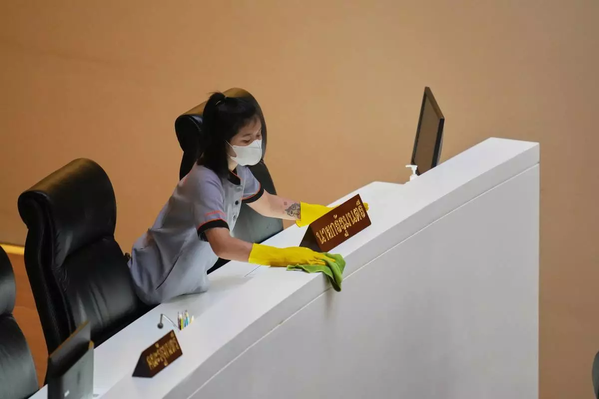 一名工作人員於2026年3月19日,周四,在泰國曼谷的國會為泰國總理阿努廷清潔辦公桌。(美聯社圖片/Sakchai Lalit) AP圖片