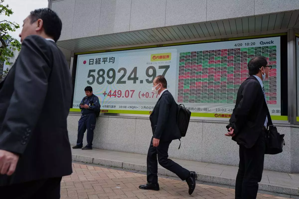 2026年4月20日周一,人們在日本東京(Tokyo)一間證券公司前,走過顯示日本日經指數的電子股價板。(美聯社圖片/Eugene Hoshiko) AP圖片