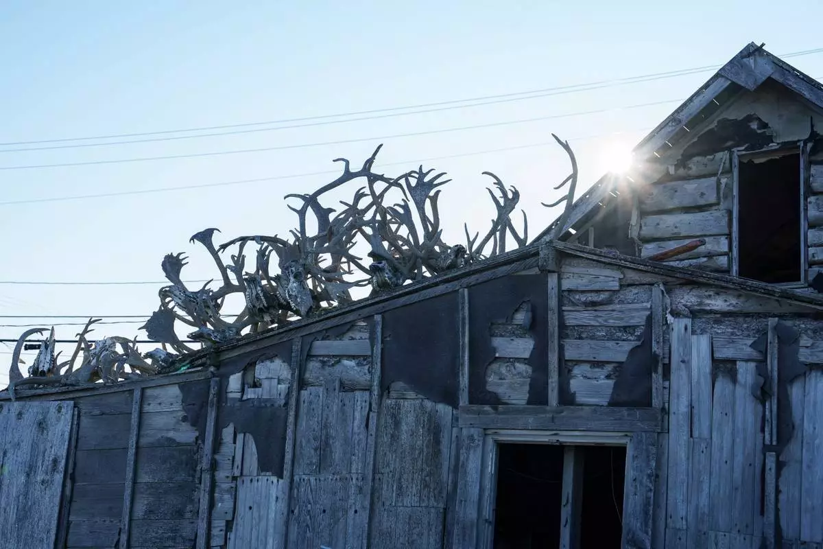 (美聯社圖片/Annika Hammerschlag) 檔案照片:2025年9月27日,馴鹿角放在阿拉斯加科策布的屋頂上。 AP圖片