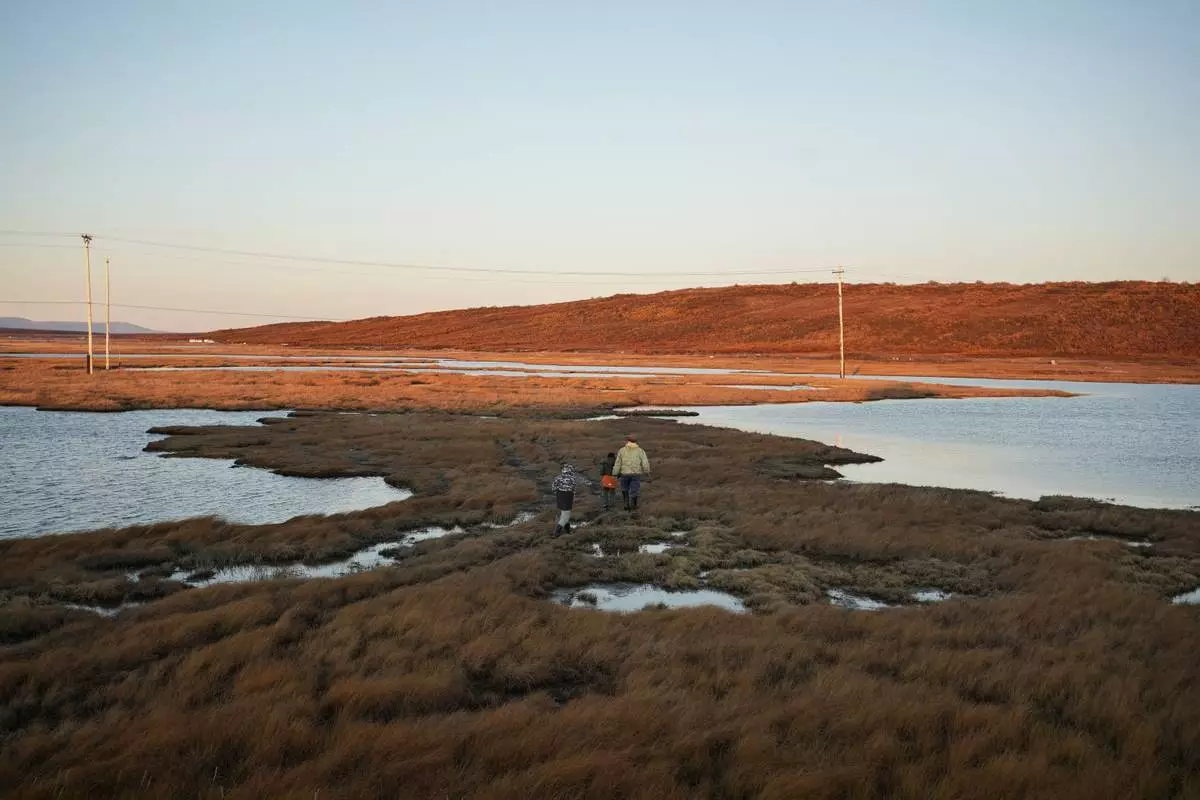 (美聯社圖片/Annika Hammerschlag) 檔案照片:2025年9月26日,因紐皮雅特獵人兼漁民羅斯威爾沙弗(Roswell Schaeffer)帶着他的曾孫占士沙弗(James Schaeffer,7歲)和占士的表弟查爾斯加拉霍恩(Charles Gallahorn,10歲)在阿拉斯加科策布狩獵。 AP圖片