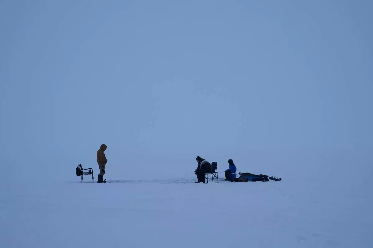 (美聯社圖片/David Goldman) 檔案照片:2024年3月3日,人們在佛蒙特州埃爾莫爾的結冰埃爾莫爾湖上冰釣。 AP圖片