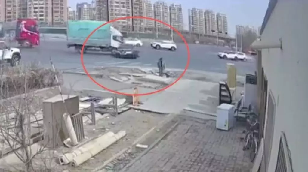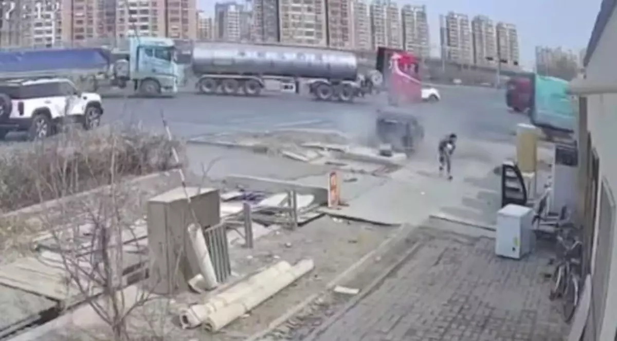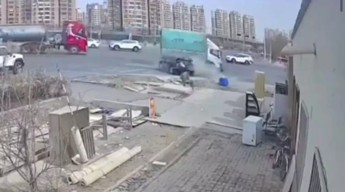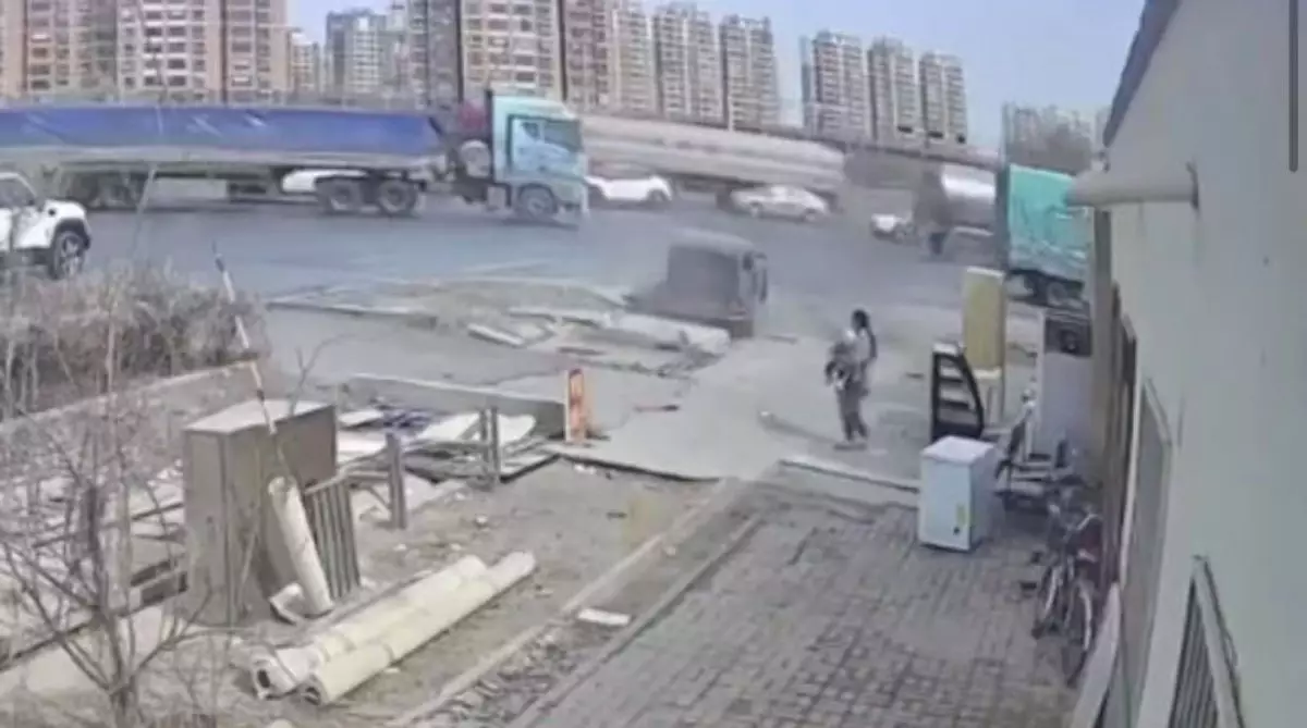 甘肅母親目睹私家車遭貨車撞後失控甩尾衝向兒子,神反應立即抱走孩子驚險避過一劫。