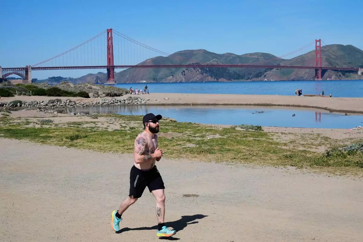 2026年3月17日周二,一名男子跑過三藩市克里西場,背景是金門大橋。(美聯社圖片/Godofredo A. Vásquez) AP圖片