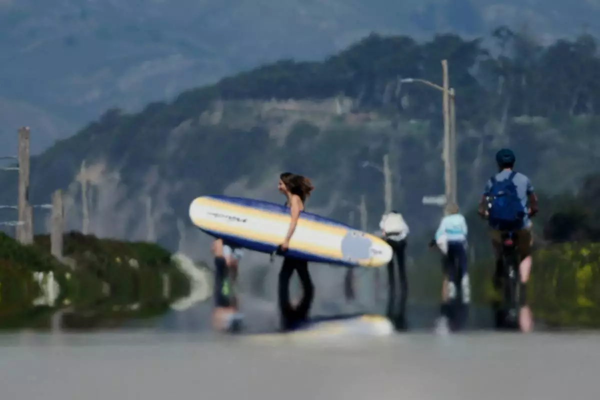 2026年3月17日周二,人們與狗隻在三藩市海洋灘(Ocean Beach)的一個大水窪中行走。(美聯社圖片/Jeff Chiu) AP圖片