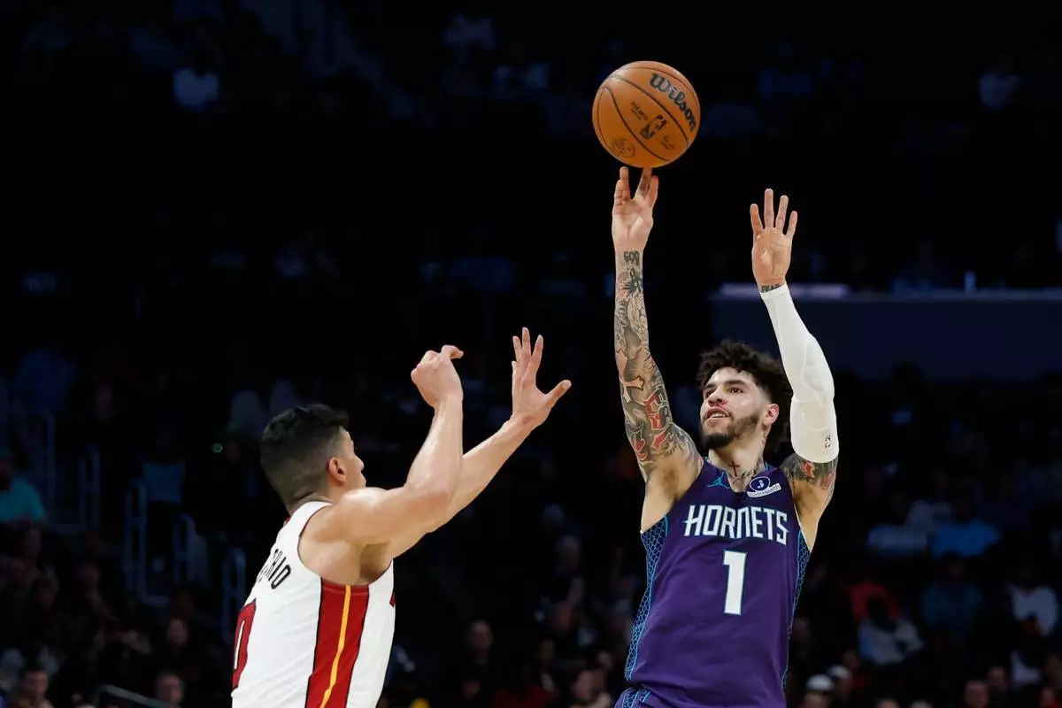 夏洛特黃蜂(Charlotte Hornets)後衛拉美路波爾(LaMelo Ball)(1號)在邁阿密熱火(Miami Heat)前鋒西蒙尼方迪基奧(Simone Fontecchio)頭上投籃。 P圖片