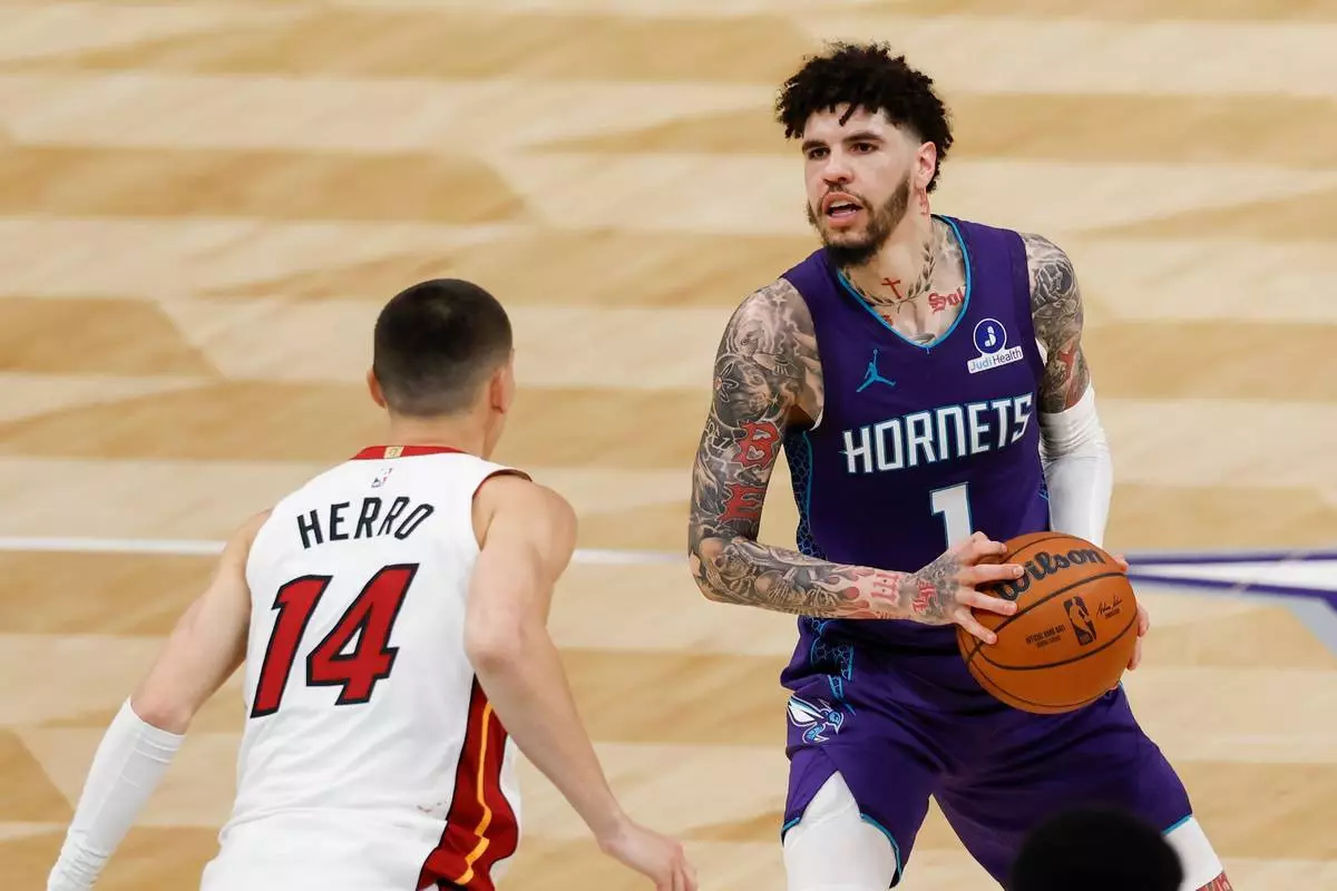 夏洛特黃蜂(Charlotte Hornets)後衛拉美路波爾(LaMelo Ball)(1號)準備對抗邁阿密熱火(Miami Heat)後衛泰萊希路(Tyler Herro)。 AP圖片