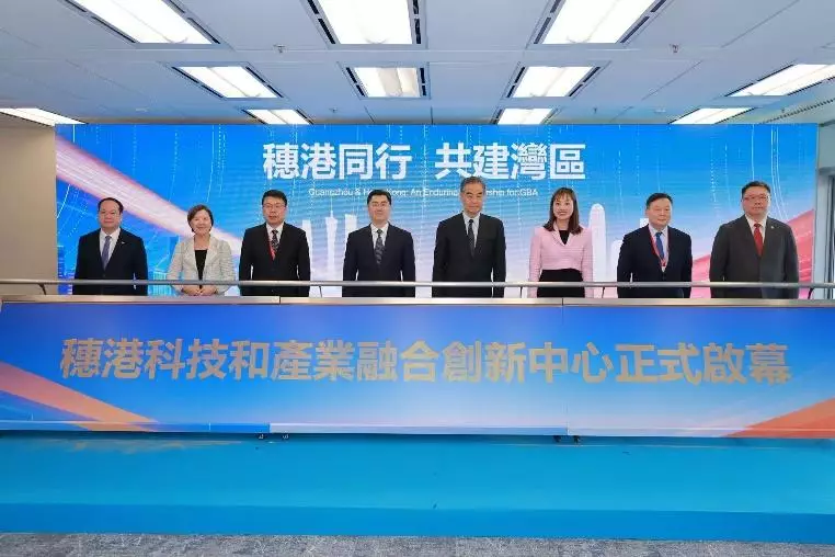全國政協副主席梁振英、廣州市市長孫志洋、中聯辦經濟部副部長呂峰、廣東省大灣區辦常務副主任朱偉先生、創新科技及工業局署理局長張曼莉女士、香港科技園公司主席查毅超博士、香港科技大學校長葉玉如教授及越秀集團董事長陳強先生一同為穗港科技和產業融合創新中心揭牌 。