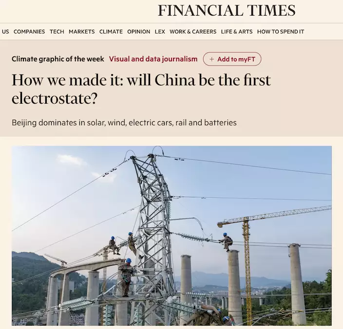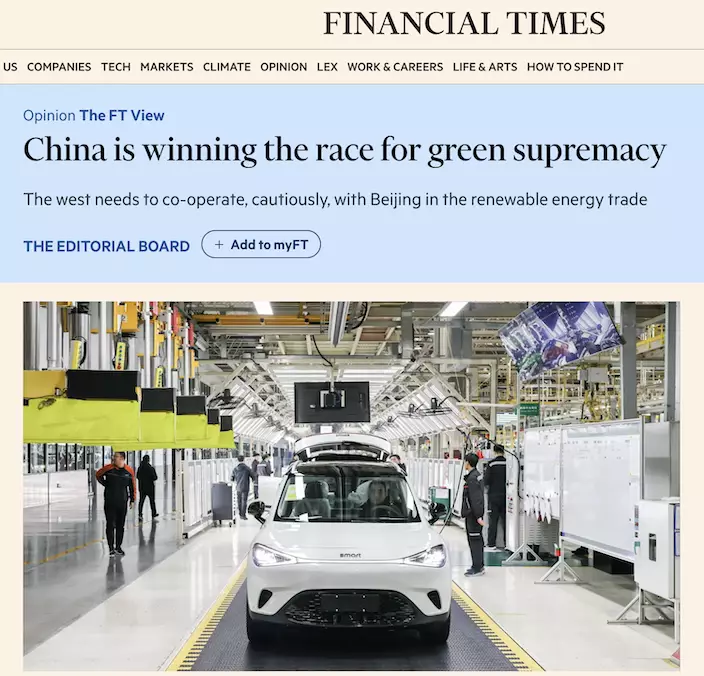 社評稱,以《金融時報》為代表的一些西方媒體,對中國綠色發展的報道經歷了一場明顯的敘事轉變。近來,《金融時報》報道的標題逐步變為《中國在綠色領導權競爭中取得勝利》《中國會成為首個電氣化國家嗎?》。這些報道的配圖,也悄然換成了宏偉的水電站、成片的光伏板、矗立山脊的風機。這些西方媒體筆下中國的角色,正從「全球最大的碳排放國,環境問題的責任方」轉向「全球綠色能源的領軍者,氣候治理的關鍵行動者」。美國《紐約時報》駐北京記者感慨,生活在清潔技術十分普及的中國,猶如「置身未來世界」。