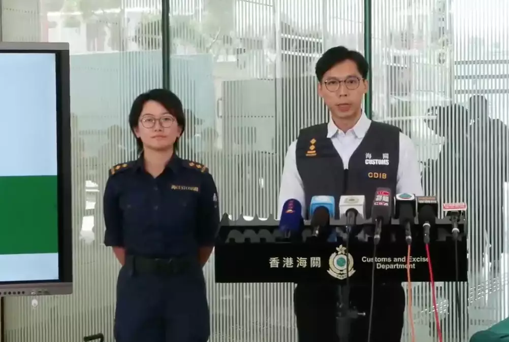 海關毒品調查科毒品調查第二組高級調查主任趙啟榮(右)及港口及海域科貨櫃貨物檢查組督察劉芷欣(左)向傳媒講述案件詳情。香港海關FB