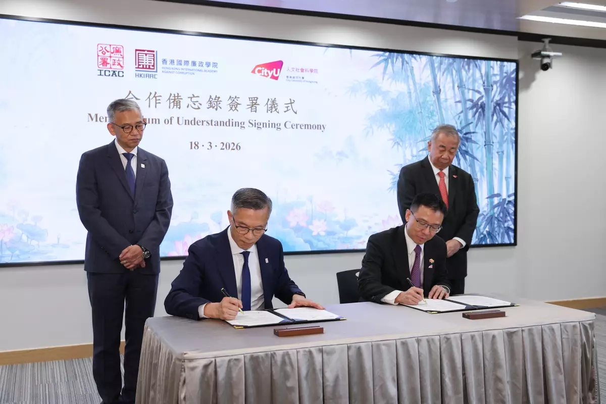 廉政公署與香港城市大學簽署合作備忘錄,由廉署香港國際廉政學院與城大人文社會科學院共同合作,推動反貪研究、培育廉潔人才。ICAC圖片