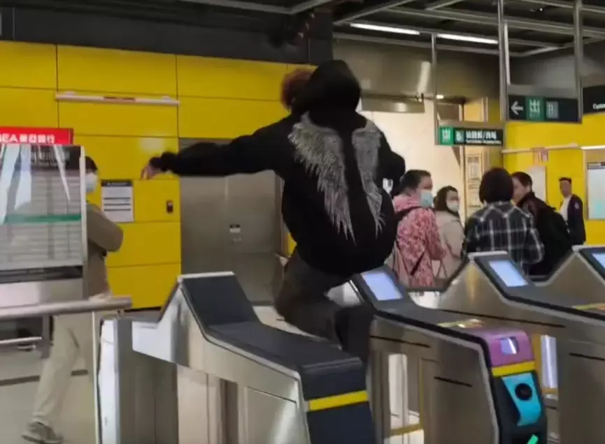 近日有網民在社交平台發佈影片「而家都玩得咁癲嘅咩,喺人哋面前逃票」。從影片可見,一名染金髮、身穿黑色翼狀圖案衞衣的青年,被一名港鐵女職員緊跟要求查票。青年全程低頭看手機未予理會,其後佯裝折返,再突然轉身加速衝向閘機。他雙手撐在閘機上,雙腳離地,流暢地一躍而過,着地後迅速逃離現場,引發現場乘客嘩然。