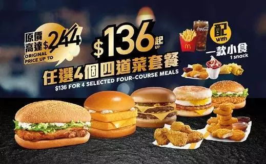至於「四重滋味套餐」只需$136 起就能歎盡 4 個套餐配一款指定小食。除了可選多款人氣超值套餐,包括板燒雞腿飽、脆辣雞腿飽和豬柳蛋漢堡套餐外,亦可加$6 可升級至雙層魚柳飽和雙層芝士孖堡套餐,又可加$7 升級至脆香雞翼(4 件)或麥樂雞 (9 件) 套餐;小食則可選麥樂雞(4 件)、蘋果批和朱古力或士多啤梨新地,歡迎大家即買即用即慳。