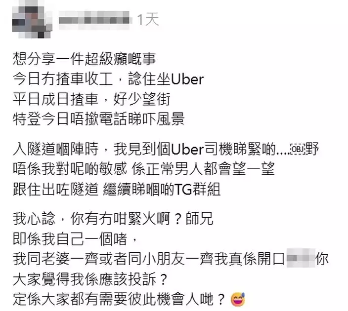 有港男日前在社交平台分享離譜經歷,指乘坐Uber時,竟發現司機在駕駛期間觀看成人影片,帖文隨即引發網民熱議,不少人直斥此舉已構成性騷擾,促事主立即投訴。