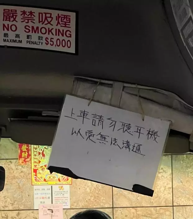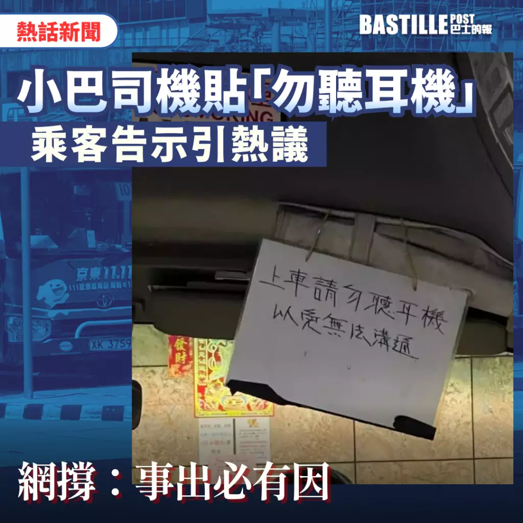 有網民在Facebook 群組發圖稱「依家搭小巴要咁樣」,相中似是小巴司機的手寫牌,上面寫著「上車請勿聽耳機,以免無法溝通」字句,但法律上未有列明坐小巴不准戴耳機,故引起大量網民關注熱議。