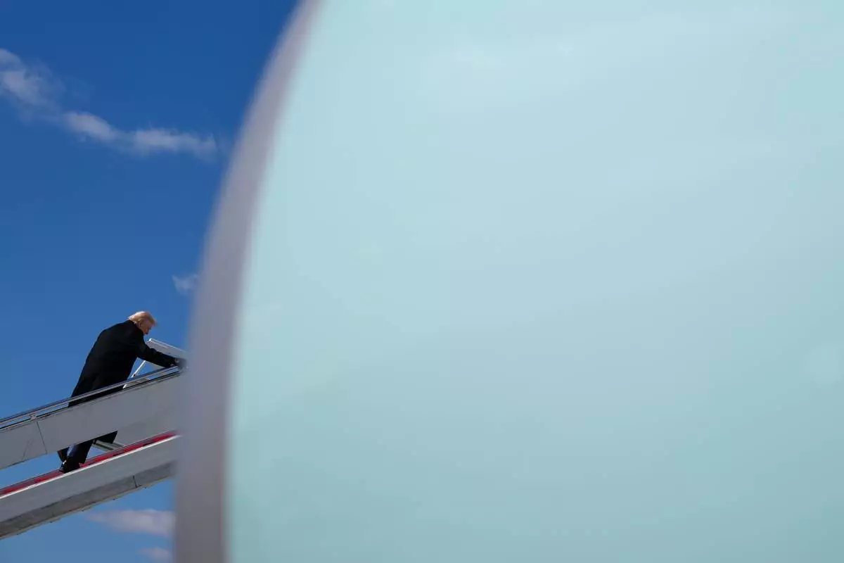 總統特朗普於2026年3月18日周三,在特拉華州多佛空軍基地(Dover Air Force Base)登上空軍一號(Air Force One),此前他出席了六名空軍加油機機組人員的遺體返國儀式,他們在支援對伊朗的行動時,飛機在伊拉克西部墜毀身亡。(美聯社圖片/Julia Demaree Nikhinson) AP圖片