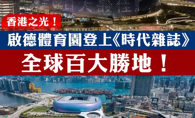 《時代雜誌》近日公布年度「2026年全球最佳勝地」名單,剛踏入開幕一周年的啟德體育園成為榜單中唯一來自香港的景點。為慶祝獲此殊榮,園方在啟德主場館外牆熒幕以中英文分別展示「啟德體育園榮膺《時代》雜誌2026全球百大最佳勝地」和「Kai Tak Sports Park:World's 100 greatest places to visit 2026(TIME)的跑馬燈,更配以煙花效果動畫。