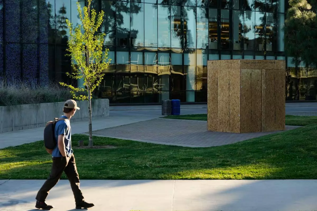 2026年3月18日周三,加州弗雷斯諾(Fresno, Calif.),加州州立大學弗雷斯諾分校(California State University, Fresno)一名學生望向覆蓋著塞薩爾查韋斯(César Chavez)雕像的木箱。(美聯社圖片/Godofredo A. Vásquez) AP圖片