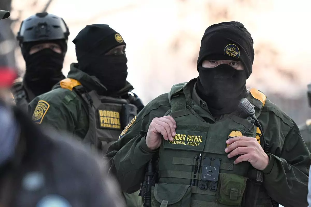 檔案圖片:2026年1月8日周四,在明尼蘇達州(Minnesota)明尼亞波利斯(Minneapolis)的畢曉普亨利惠普爾聯邦大樓(Bishop Henry Whipple Federal Building)外,聯邦探員注視著聚集的示威者。(美聯社圖片/Tom Baker) AP圖片