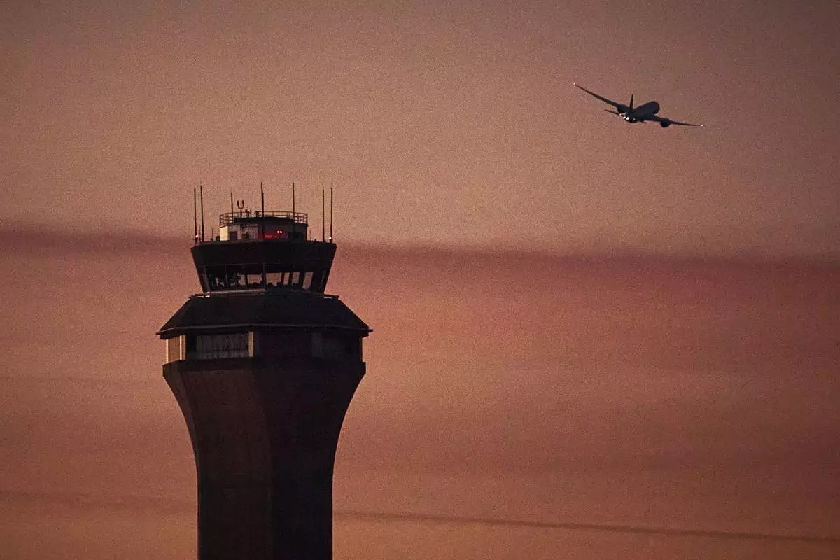 資料圖片:一架飛機飛越紐瓦克自由國際機場(Newark Liberty International Airport)的控制塔,攝於2025年11月7日,美國新澤西州紐瓦克。(美聯社圖片/Andres Kudacki) AP圖片