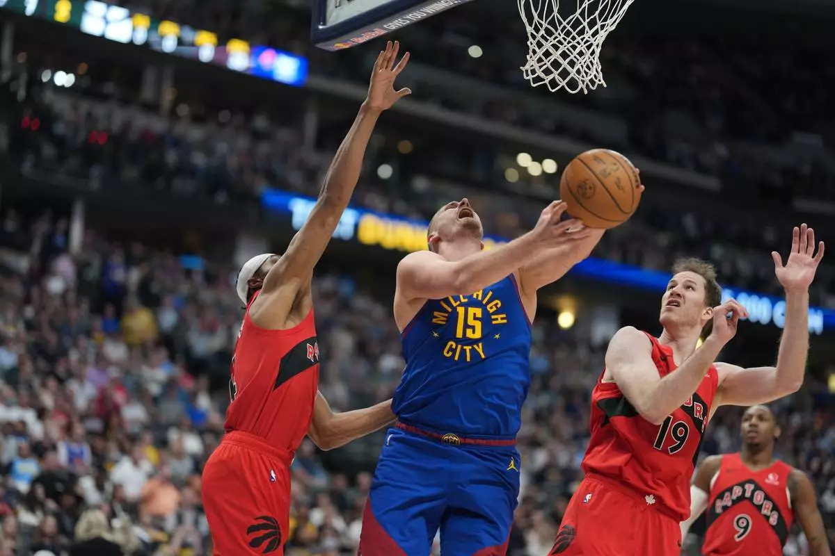 丹佛金塊中鋒祖傑在周五(2026年3月20日)於丹佛舉行的一場NBA籃球賽上半場,在多倫多速龍前鋒布蘭登英格倫(左)及中鋒普爾特爾(右)之間切入籃下。(美聯社圖片/David Zalubowski) AP圖片