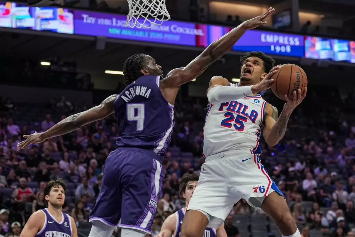 費城76人前鋒巴洛(Dominick Barlow,25號)上籃,對抗薩克拉門托帝王前鋒阿祖華(Precious Achiuwa,9號)。 AP圖片