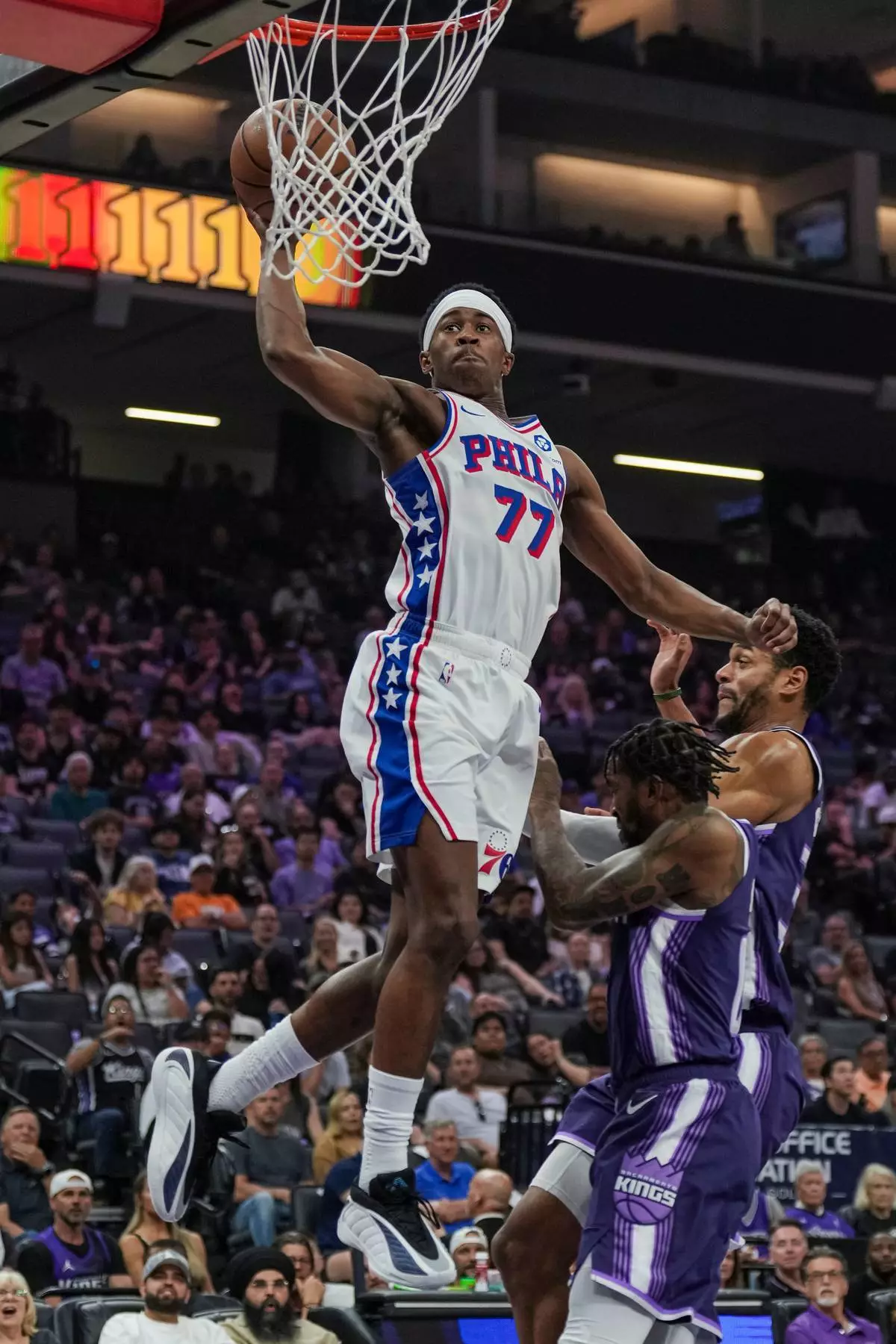 費城76人後衛艾治甘比(Vj Edgecombe,77號)在NBA籃球賽上半場對陣薩克拉門托帝王時入樽。)AP圖片