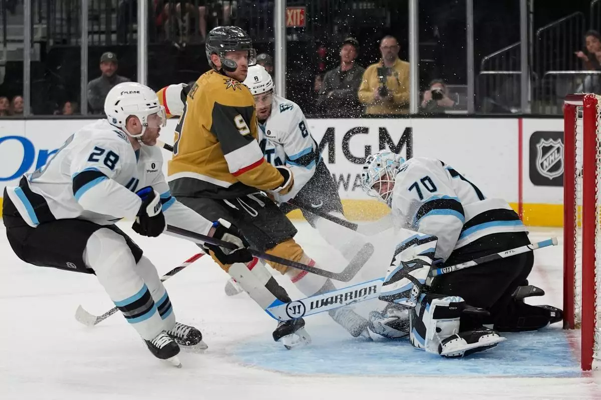 猶他猛獁隊右翼克萊頓凱勒(Clayton Keller)(9號)在2026年3月19日(周四)於拉斯維加斯舉行的一場國家冰球聯盟(NHL)賽事第一節期間,射門攻入維加斯金騎士隊門將艾丁希爾(Adin Hill)(33號)的球門。(美聯社圖片/John Locher) AP圖片