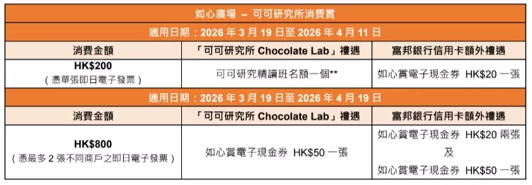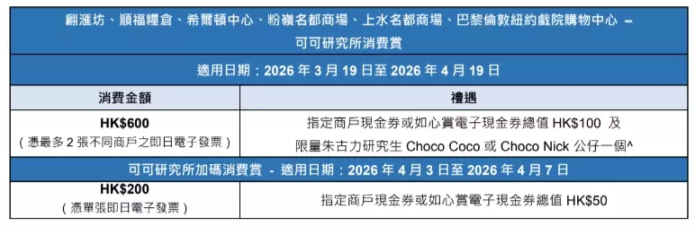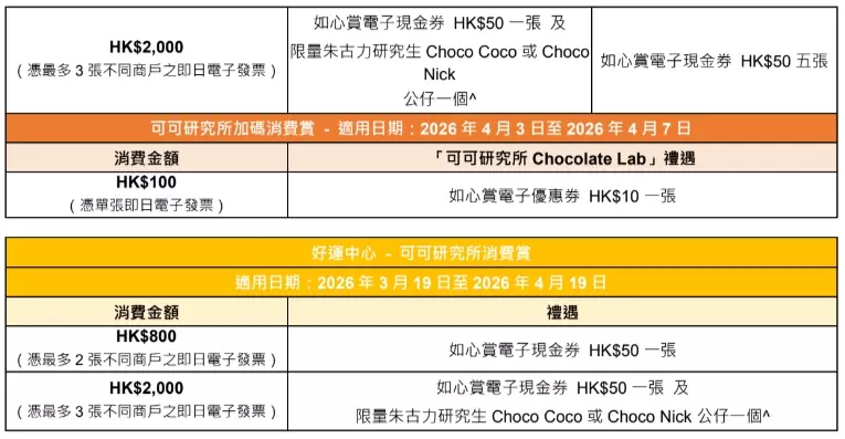 華懋集團旗下8大商場合力大派廿萬電子現金券五日復活連假獎賞加碼為了讓節日歡樂氣氛升溫,如心廣場聯同華懋集團旗下7大商場—好運中心、翩滙坊、希爾頓中心、順福糧倉、粉嶺名都商場、上水名都商場及巴黎倫敦紐約戲院購物中心,壓軸推出多項消費獎賞及禮遇,大派逾廿萬現金券,讓大家輕鬆消費購物,與親友盡情享受悠長假期。活動期內,如心賞會員透過富邦銀行信用卡於如心廣場憑電子消費*滿指定金額,更可同時參與兩個消費賞—「可可研究所消費賞」及「富邦銀行賞上賞」,以富邦信用卡簽賬滿指定金額,可獲額外如心賞電子現金券獎賞!而在4月3至7日期間的五日復活連假,8大商場消費獎賞更會加碼,讓大家以更低的消費門檻換領現金券!除了現金券外,8大商場亦會送出限量萌爆朱古力研究生Choco Coco及Choco Nick公仔,讓大家把這次可可探索之旅延續至家中!