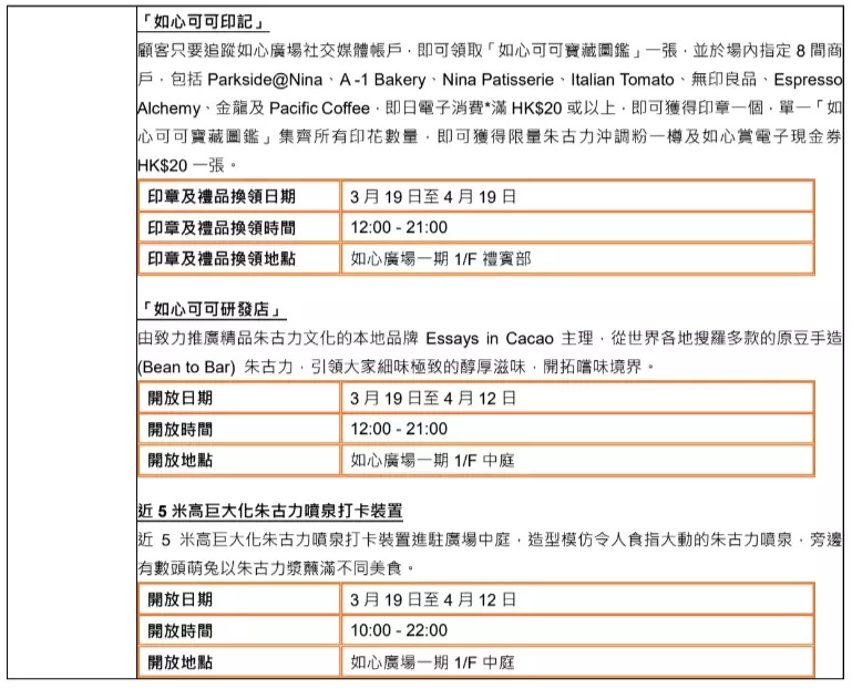 同時還與本地飲食及旅遊界猛人輪流對談,一同探索朱古力與咖啡、美酒、鹹點,拼配出無限可能。「如心可可印記」尋寶活動亦會同步展開,於8間指定商戶憑指定消費集齊所有印章,即可免費捧走限量朱古力沖調粉及現金券。「如心可可研發店」同步登陸如心廣場中庭,引進一系列坊間罕見的Bean-to-Bar精品朱古力,讓大家體驗可可的極致美味。最後,不要錯過華懋集團旗下8大商場聯手推出的多項節慶消費獎賞及禮遇,大派逾廿萬現金券,把歡樂氣氛推至高峰!