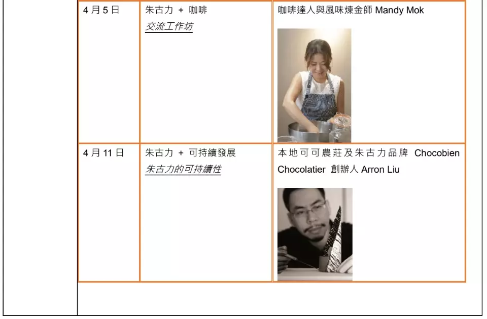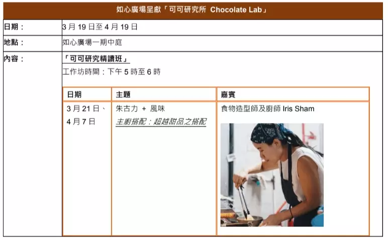 3月21至4月11日期間,指定六個假日,如心廣場將舉辦「可可研究精讀班」,由IICCT國際認證朱古力品鑑師Manman Chan主持多場工作坊,與大家從不同面向發掘朱古力的無窮魅力,話題由可可起源及歷史等冷知識,到朱古力拼配不同美食佳釀的驚喜體驗,以至圍繞朱古力展開的旅遊探索,絕對能讓大家沉醉於濃郁朱古力的幸福滋味!本地飲食及旅遊界標誌性人物,包括食物設計師及廚師IrisSham、世界頂尖調酒大賽2025得獎者Jack Ng、本地可可農莊及朱古力品牌Chocobien Chocolatier創辦人ArronLiu、「字字研究所」創辦人呂嘉俊,以及咖啡達人與風味煉金師Mandy Mok,將輪流亮相,與大家分享及親嚐精品朱古力拼配啡酒及鹹點的奇妙滋味。所有參加者完成「可可研究精讀班」後,將獲贈有機可可茶一罐!