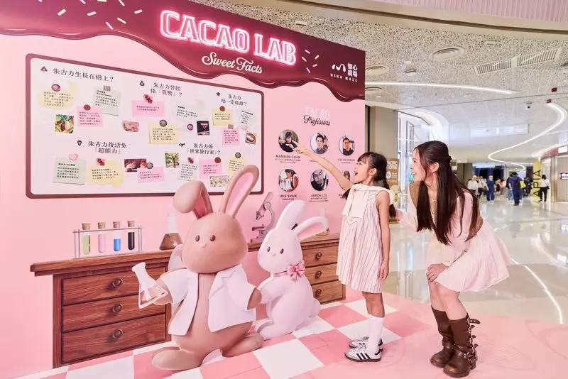 最後,不要錯過華懋集團旗下8大商場聯手推出的多項節慶消費獎賞及禮遇,大派逾廿萬現金券,把歡樂氣氛推至高峰!打卡必去!近5米高巨大化朱古力噴泉裝置甜爆登場朱古力實驗室探索可可奧秘5米高巨大化朱古力噴泉裝置朱古力實驗室打卡牆近5米高巨大化朱古力噴泉主題裝置將進駐如心廣場中庭,造型模仿讓人食指大動的朱古力噴泉,旁邊有數頭萌兔以朱古力漿蘸滿不同美食。灑滿七彩糖針的朱古力漿,繽紛搶眼,叫人心動不已,絕對要擺出萌爆甫士,盡情拍照打卡!旁邊的朱古力實驗室打卡牆貼上多個朱古力冷知識,實驗室由6位星級教授為大家揭開朱古力的神秘面紗,探討朱古力歷史及朱古力與咖啡、美酒、鹹點的夢幻搭配。朱古力實驗室的背面更呈現5款受歡迎的朱古力,快來畫鬼腳了解每款口味的獨特之處吧!