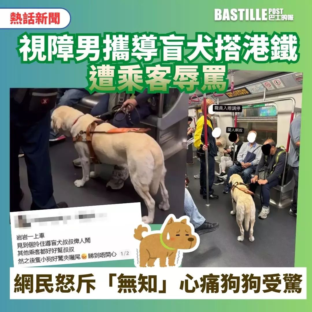 日前網上流傳一段影片,顯示一名視障男子攜同導盲犬乘搭港鐵時,在車廂內疑似遭其他乘客辱罵而發生爭執。導盲犬受驚下仍站在主人身前戒備,場面令人心痛,事件隨即引發網民熱議。