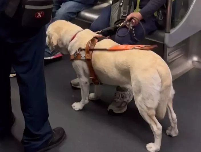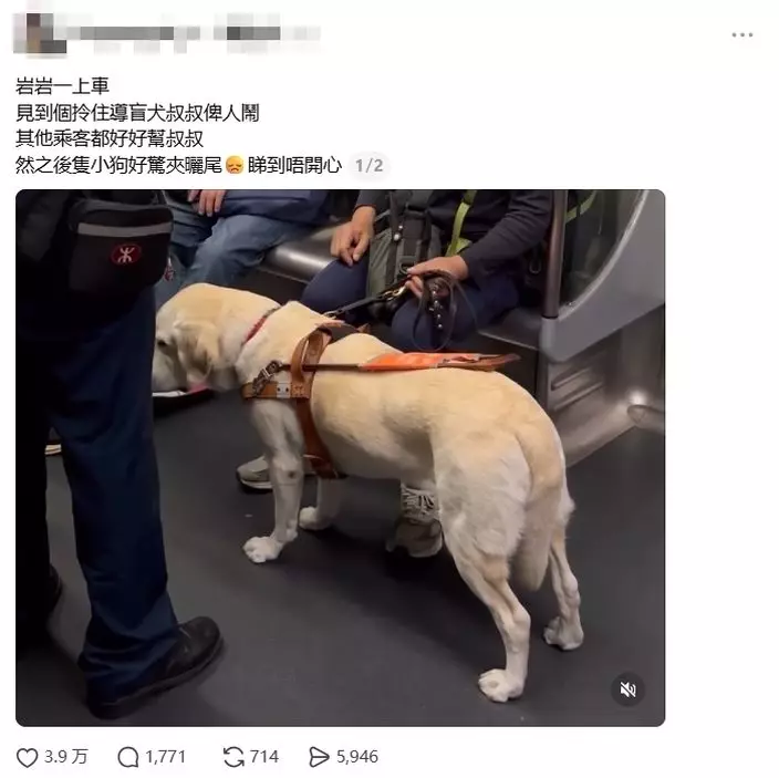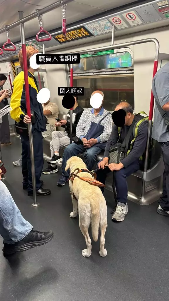 拍攝者將影片上載至社交平台 Threads,無奈表示一上車便目睹帶著導盲犬的男子被罵。從影片可見,視障叔叔坐在座位上,導盲犬站於其腿前,尾巴向下緊夾,旁邊有一名港鐵職員在場調解,但爭執起因未明。拍攝者慨嘆,平時導盲犬多會躺下或趴下,但當時牠知道要保護主人便立即站起,「但條尾呃唔到人,夾曬尾表示好驚驚」。拍攝者續指,狗狗雖然受驚,卻仍盡忠職守,「一到站就即刻走向門口,頭也不回咁,帶主人走,仲帶主人搭升降機」。