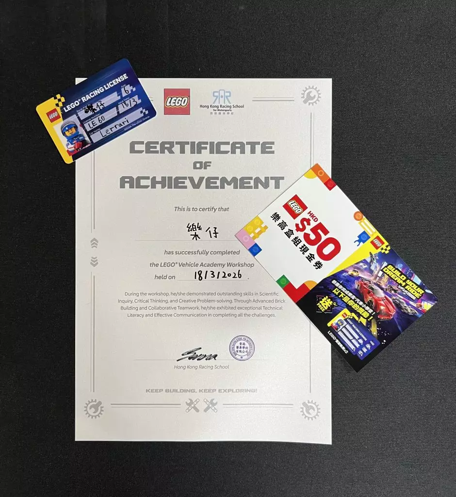 每位完成特訓班的小車手,會獲頒發「樂高®小車神」證書,以及贈送 LEGO 購物現金券$50 乙張,定必是家長與孩子於復活節假期共享歡樂時光的絕佳活動。