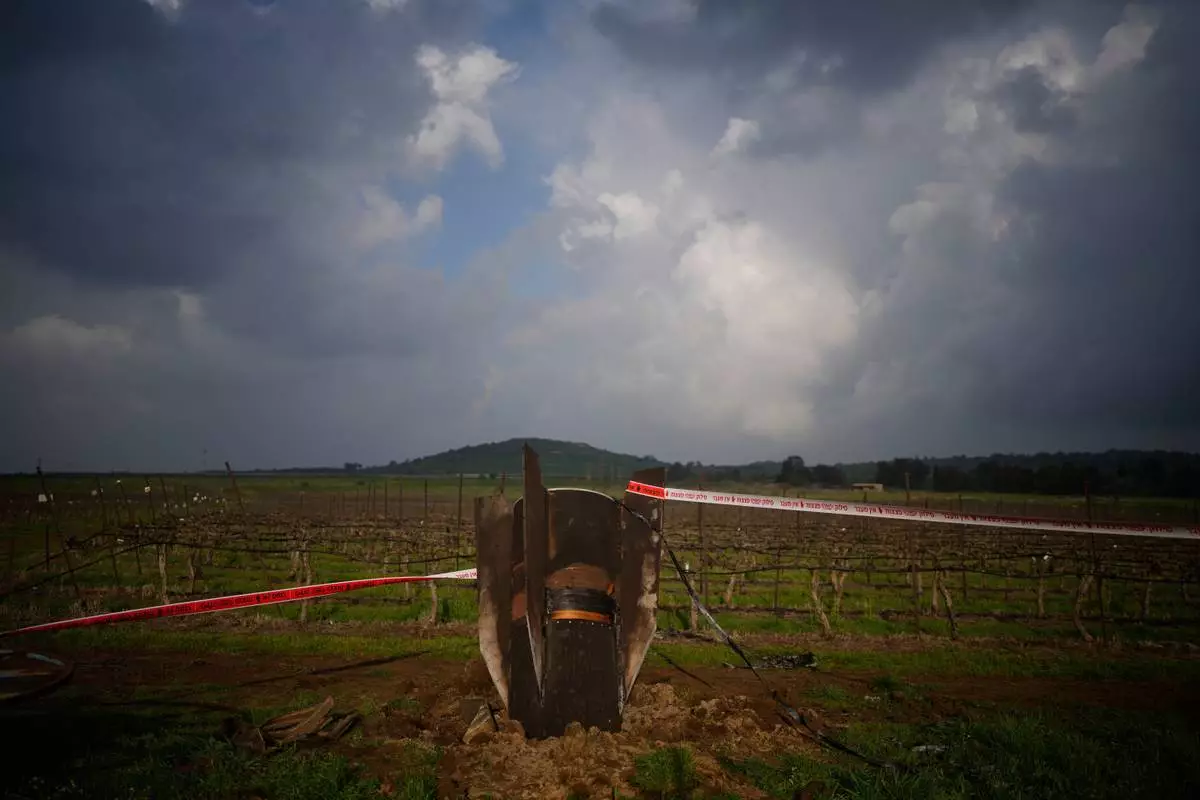 2026年3月19日周四,一枚從伊朗發射並被以色列防禦系統攔截的導彈碎片,插在以色列控制的戈蘭高地(Golan Heights)一片空地上。(美聯社圖片/Ohad Zwigenberg) AP圖片