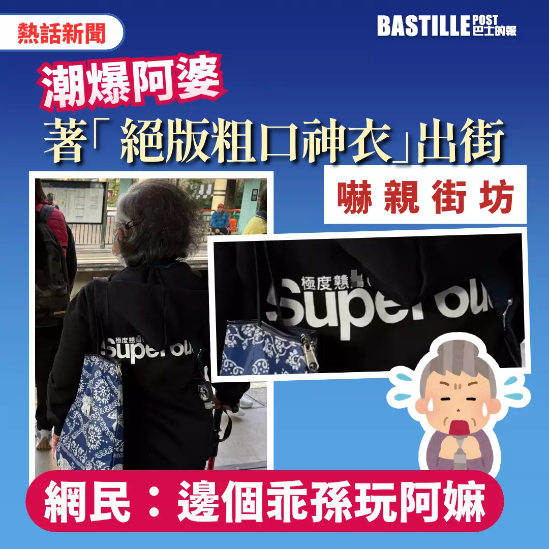 不少網友爆笑留言指「拎咗soon仔件衫着?孫仔返屋企喊死」、「可能阿婆想用背脊鬧全世界,無聲抗議加價最型」、「潮爆長者」。