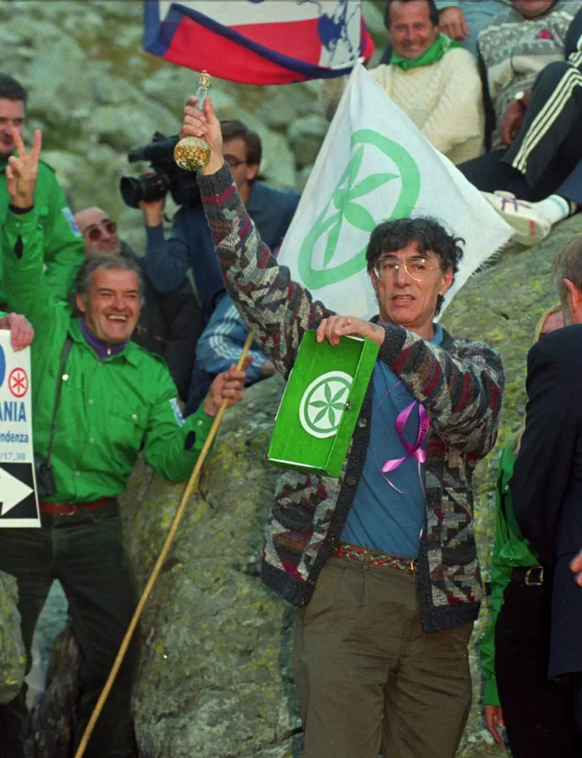 1996年9月13日,北方聯盟民粹領袖翁貝托·博西手持一個水壺,內有他剛從意大利北部克里索洛(Crissolo)波河源頭取出的水。博西於2026年3月19日周四逝世,享年84歲。(美聯社圖片/Luca Bruno 檔案照) AP圖片