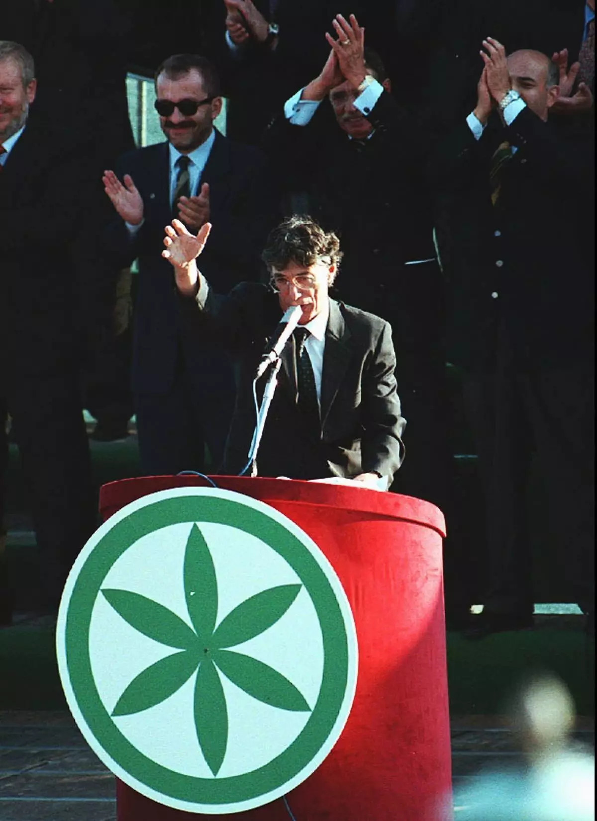 1996年9月15日,北方聯盟領袖翁貝托·博西在威尼斯一場集會上,宣布意大利波河以北地區「帕達尼亞」獨立,獲群眾鼓掌。博西於2026年3月19日周四逝世,享年84歲。(美聯社圖片/Luca Bruno 檔案照) AP圖片