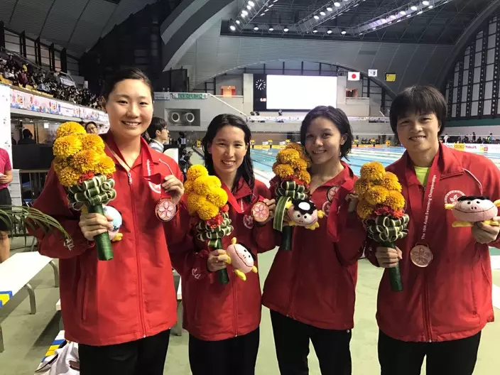 陳健樂聯同施幸余、劉彥恩、于蕙婷,合力在女子4x100米自由泳接力,為港隊增添銅牌。(香港業餘游泳總會圖片)