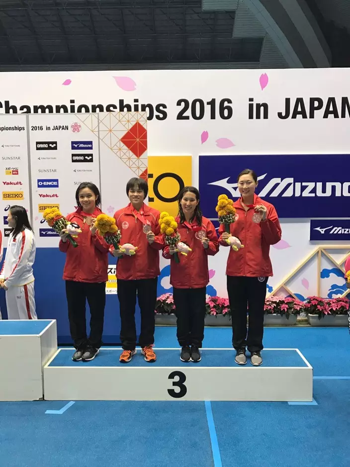 陳健樂聯同施幸余、劉彥恩、于蕙婷,合力在女子4x100米自由泳接力,為港隊增添銅牌。(香港業餘游泳總會圖片)