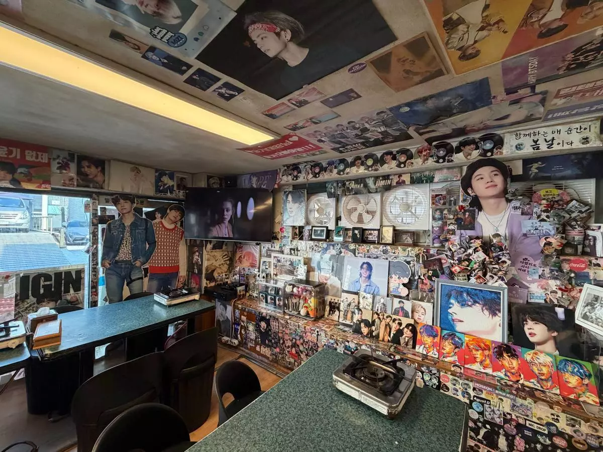 2026年3月20日,周五,南韓首爾,柳亭食堂(Yoojung Sikdang)的牆壁上裝飾著K-pop團體BTS的照片。BTS成員在練習生時期經常在這間首爾餐廳用餐。(美聯社圖片/Juwon Park) AP圖片