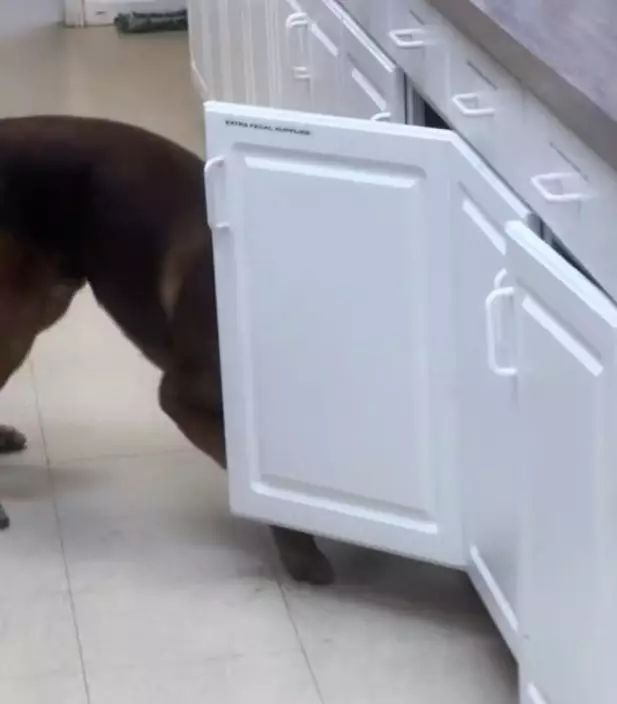 虎斑貓藏身櫥櫃被比利時牧羊犬迅速尋獲露不爽神情。TikTok圖片