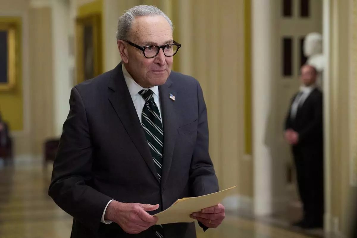 參議院民主黨領袖舒默(Chuck Schumer)周二(2026年3月17日)在華盛頓國會山莊出席記者會。(美聯社圖片/Jacquelyn Martin) AP圖片