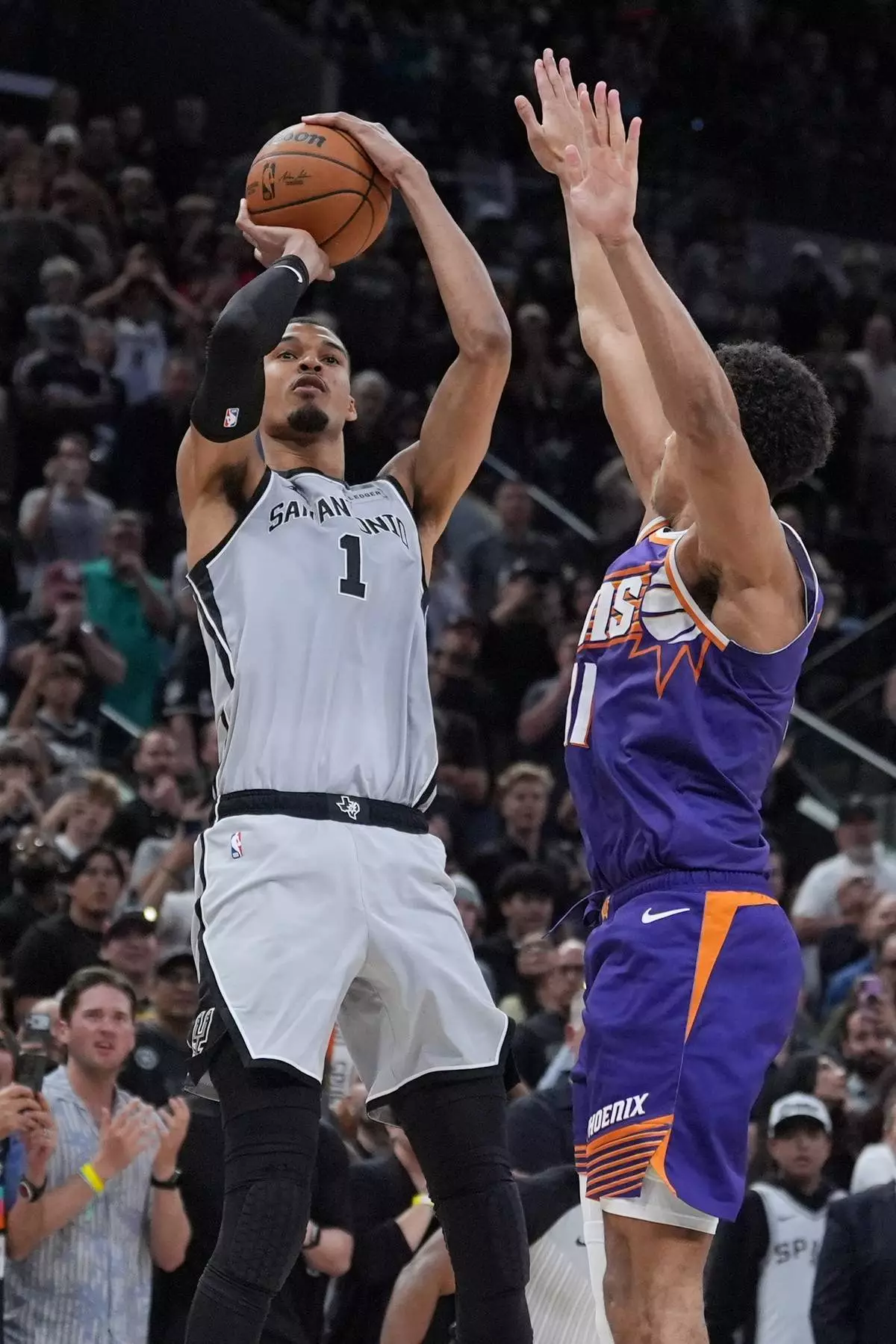 2026年3月19日,聖安東尼奧馬刺前鋒維克多·文班亞馬(Victor Wembanyama)(1號)在NBA籃球賽下半場最後幾秒,射入致勝一球,擊敗鳳凰城太陽前鋒奧素伊格達羅(Oso Ighodaro)(11號)。攝於聖安東尼奧。(美聯社圖片/Eric Gay) AP圖片