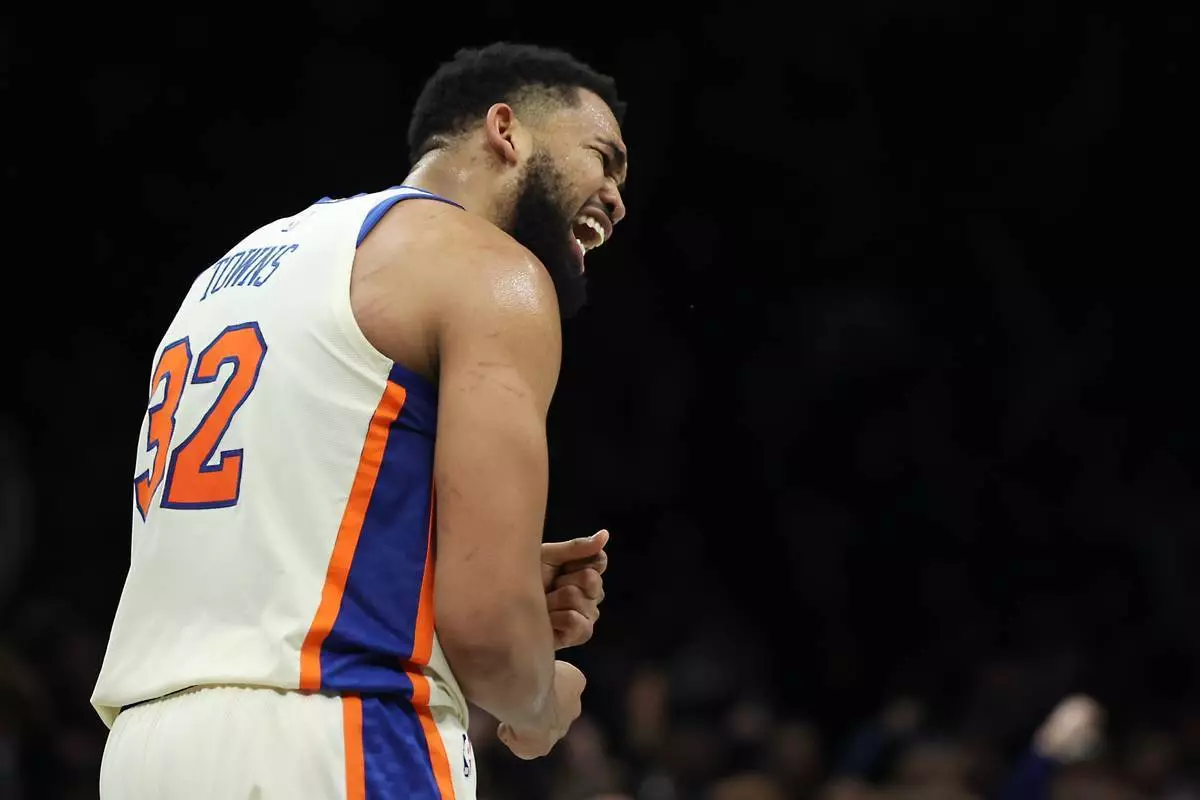2026年3月20日(周五),紐約,NBA籃球賽下半場,紐約人中鋒卡爾安東尼唐斯(Karl-Anthony Towns,32號)作出反應。 (美聯社圖片/Heather Khalifa) AP圖片