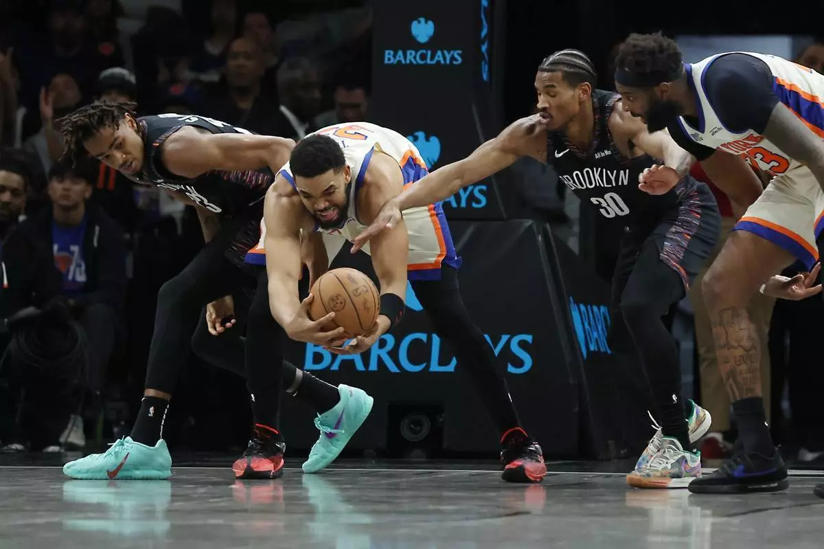 2026年3月20日(周五),紐約,NBA籃球賽上半場,布魯克林籃網中鋒尼克拉斯頓(Nic Claxton,左)與布魯克林籃網後衛奧查伊阿巴治(Ochai Agbaji,30號)爭奪籃球,對抗紐約人中鋒卡爾安東尼唐斯(Karl-Anthony Towns,左二)。 (美聯社圖片/Heather Khalifa) AP圖片