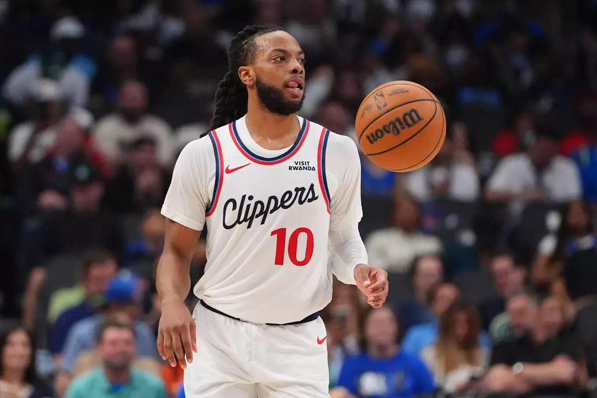 2026年3月21日周六,達拉斯,洛杉磯快艇後衛達里烏斯·加蘭在NBA籃球賽下半場對陣達拉斯獨行俠時運球。(美聯社圖片/LM Otero) AP圖片