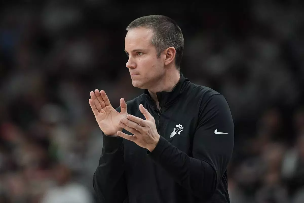 2026年3月19日周四,鳳凰城太陽隊主教練佐敦奧特(Jordan Ott)在聖安東尼奧(San Antonio)對陣聖安東尼奧馬刺隊(San Antonio Spurs)的NBA籃球賽下半場,為其球員鼓掌。(美聯社圖片/Eric Gay) AP圖片